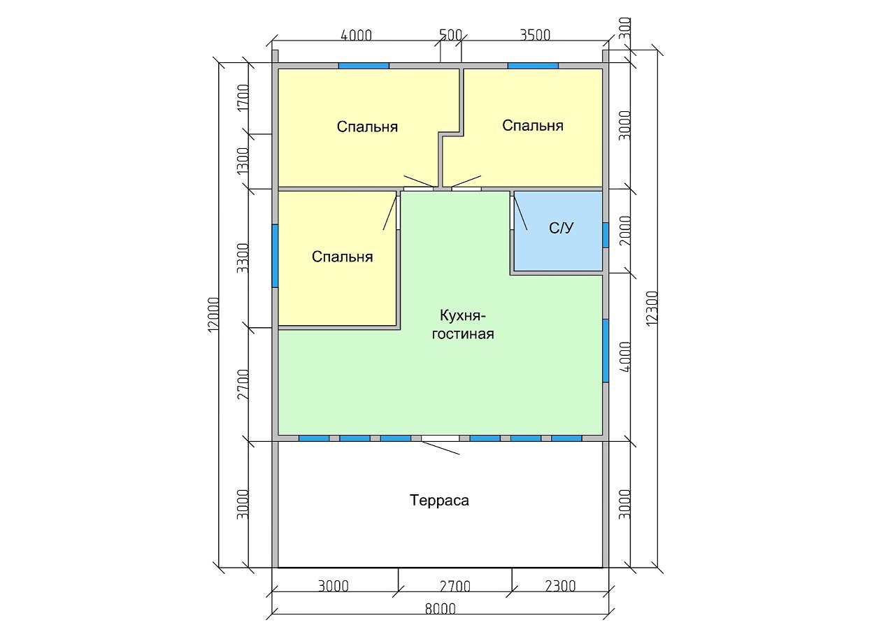 Площадь составляет 96 м2. Сразу на входе – просторная кухня-гостиная, которую можно удобно зонировать. Три изолированные спальни, обустроенный санузел. Для организации хранения вещей предусмотрена антресоль, на которую ведет компактная и прочная 10-ступенчатая лестница. Большая терраса на входе, где можно обустроить удобную зону отдыха.